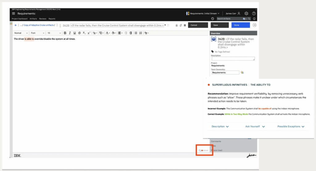 QVscribe works seamlessly within DOORS Next, delivering requirements quality analysis, scoring, and rewrite guidance as requirements are authored.
